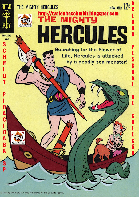O PODEROSO HÉRCULES Nº 01 - 1963 GOLD KEY COMICS / Uma produção de 1963, os quadrinhos deste herói, veio juntamente na mesma época do desenho animado para a televisão. Aqui no Brasil, a última emissora a exibir este clássico desenho com a dublagem antiga da época de sua primeira exibição, foi a Rede Tupi de Televisão, do estúdio AIC-SP. O SBT, Cartoon Network, e Boomerang após longos anos de seu desaparecimento em terras brasileiras, voltou a exibir o desenho em cores vivas e perfeitas, porém, com uma dublagem inferior à realizada pela magnífica AIC-SP! As aventuras ocorrem na Grécia antiga, quando do alto do Monte Olimpo, lar dos deuses gregos, Hércules, filho de Zeus, recebe como prêmio de melhor guerreiro numa disputa com seu amigo Tycius, um pedido pessoal de seu filho, a permissão para ir ao mundo dos mortais, proteger as pessoas boas que precisariam de sua ajuda, quando o mal tentasse dominar o mundo deles! Zeus não se opõe, porém avisa Hércules, que ao descer a esse mundo, sua força se perderia, e com ela sua imortalidade também. Mesmo assim, o jovem Hércules, insiste em seu pedido, e então, Zeus dá a Hércules, um anel mágico, e quando todas as vezes se sentisse em perigo, ou precisasse de sua força e imortalidade, era só erguê-lo aos céus e seu poder retornaria durante o tempo que precisasse.
